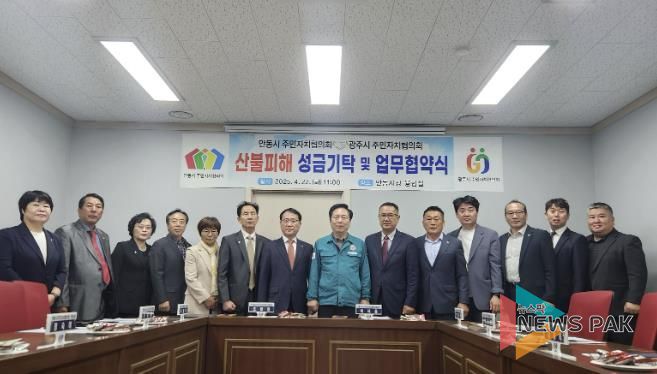 뉴스팍 이화형 기자 | 광주시 주민자치협의회는 22일 최근 대형산불로 막대한 피해를 입은 자매도시 경북 안동시를 방문해 안동시 주민자치협의회에 위로의 뜻을 전하고 산불 피해 복구를 위한 성금 1천만 원을 전달했다.