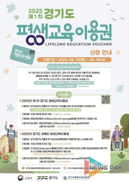 뉴스팍 이화형 기자 | 광주시는 시민의 평생학습 참여 기회를 확대하고 학습 격차 해소를 위해 오는 5월 14일까지 ‘2025년 제1차 경기도 평생교육 이용권’ 신청자를 모집한다고 25일 밝혔다.