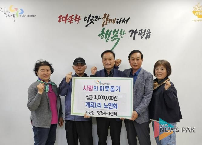 뉴스팍 배상미 기자 | 가평군 가평읍 개곡1리 노인회가 최근 가평읍 행정복지센터를 찾아 이웃돕기 성금 100만 원을 전달했다.