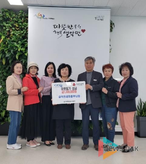김정희 설악면부녀회장은 “회원들의 정성과 노력이 담긴 소중한 수익금을 어려운 이웃에게 보탬이 될 수 있도록 전달하게 돼 기쁘다”며 “앞으로도 지역사회와 함께하는 따뜻한 활동을 이어가겠다”고 밝혔다.