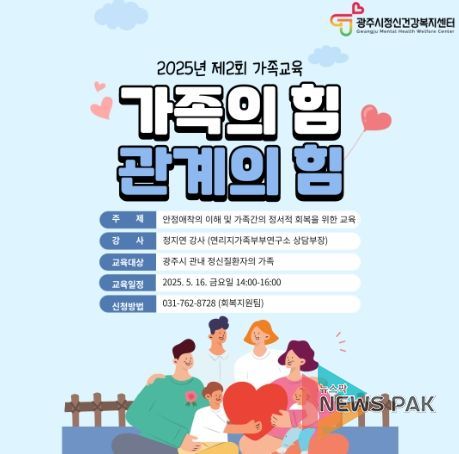 뉴스팍 이화형 기자 | 광주시정신건강복지센터는 오는 16일 광주시보건소에서 정신질환자 가족을 대상으로 한 교육 프로그램 ‘가족의 힘, 관계의 힘’을 운영한다고 1일 밝혔다.