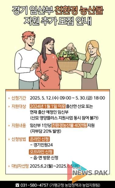 뉴스팍 배상미 기자 | 가평군은 관내 임산부에게 연 40만원 상당(개인부담 20%)의 친환경 농산물을 지원하는 ‘경기 임산부 친환경 농산물 지원사업’을 이달 30일까지 추가접수 한다고 밝혔다.