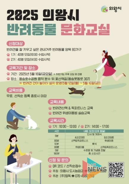 뉴스팍 류은정 기자 | 의왕시는 반려동물과 시민이 함께 건강하고 행복하게 살아가는 반려문화를 조성하기 위해 ‘2025년 상반기 반려동물 문화교실’을 개최한다.