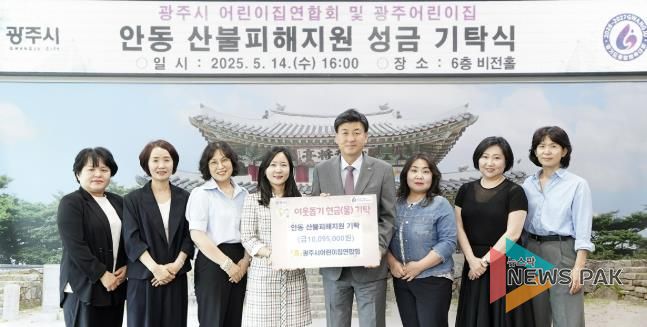 뉴스팍 이화형 기자 | 광주시 어린이집연합회는 지난 14일 시청 비전홀에서 경북 안동 산불 피해 복구를 위한 성금 1천109만 5천 원을 기탁했다.