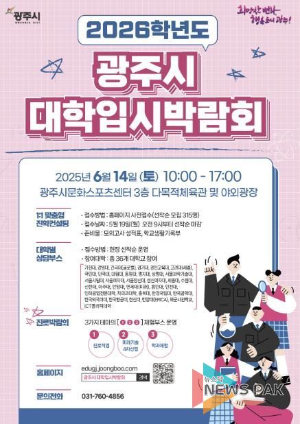 뉴스팍 이화형 기자 | 광주시는 오는 6월 14일 오전 10시부터 광주시문화스포츠센터 다목적체육관에서 ‘2026학년도 대학입시·진로박람회’를 개최한다고 20일 밝혔다.