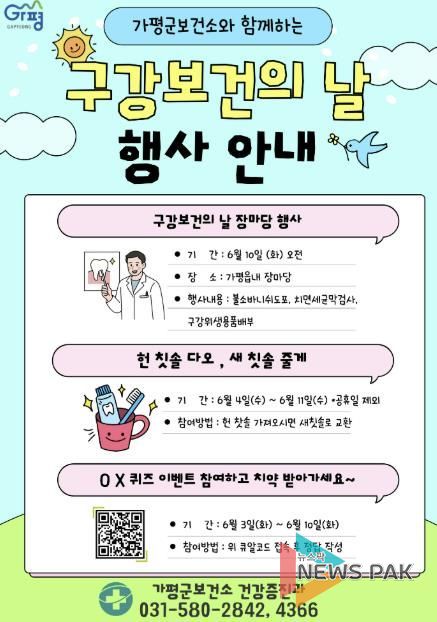 뉴스팍 배상미 기자 | 가평군보건소는 제80회 구강보건의 날을 기념해 오는 6월 3일부터 11일까지 ‘구강보건 주간 행사’를 운영한다.