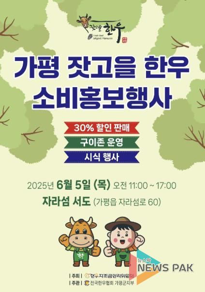 뉴스팍 배상미 기자 | 가평군은 ‘제1회 가평 잣고을 한우 소비 홍보 행사’가 오는 6월 4일부터 5일까지 자라섬 서도에서 열린다고 밝혔다.