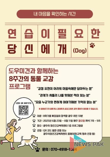 뉴스팍 이화형 기자 | 광주시정신건강복지센터는 오는 6월 23일부터 8월 11일까지 8주간 2025 마음건강 회복 프로그램 ‘연습이 필요한 당신에개(dog)’를 운영한다고 28일 밝혔다.