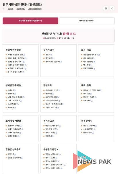 뉴스팍 이화형 기자 | 광주시는 시민 생활에 꼭 필요한 정보를 한눈에 확인할 수 있는 디지털 안내 서비스 ‘광클모드(광주시민 생활 안내 클릭으로 모두 드림)’를 시청 홈페이지에 새롭게 개설했다고 29일 밝혔다.