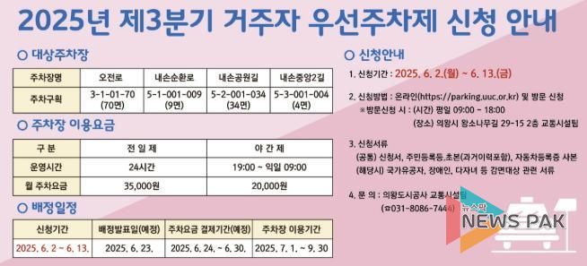 뉴스팍 류은정 기자 | 의왕도시공사는 내손동 및 오전동 지역 주민들을 대상으로오는 6월 2일부터 6월 13일까지‘2025년 제3분기 거주자 우선주차제’신청을 받는다.
