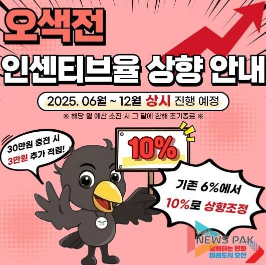 뉴스팍 이소율 기자 | 오산시가 시민이 체감할 수 있는 지역경제 정책을 본격 추진한다. 오는 6월부터 지역화폐 ‘오색전’의 상시 인센티브율을 기존 6%에서 10%로 확대하고, 월 충전 한도 또한 조정해 더 많은 시민이 실질적인 혜택을 누릴 수 있도록 개편에 나선다.