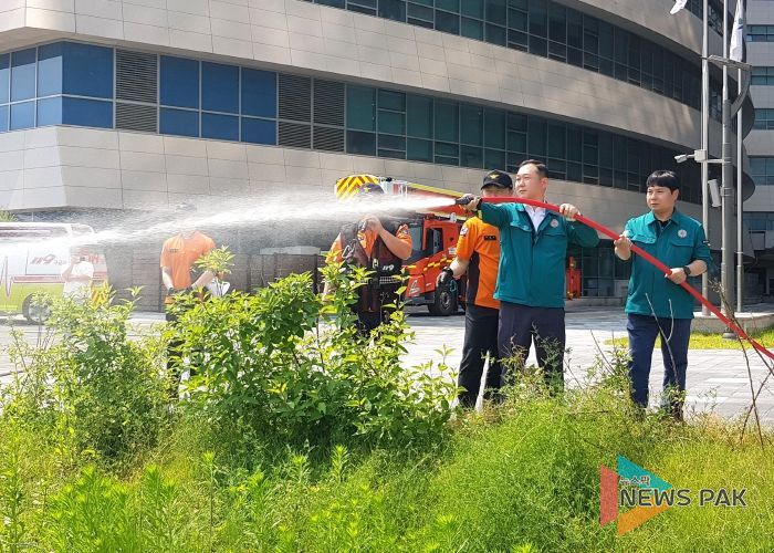 뉴스팍 배상미 기자 | 경기도교육청이 30일 오후 남부청사 옥외 잔디광장에서 수원소방서 이의119안전센터와 함께‘2025년 상반기 남부청사 소방 합동훈련’을 실시했다.