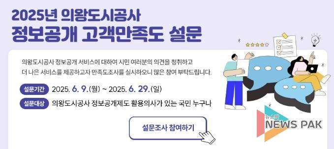 뉴스팍 류은정 기자 | 의왕도시공사는 행정의 투명성과 정보공개 제도 개선을 위해 2024년에 이어 2025년에도 시민을 대상으로 하는 ‘정보공개 고객만족도 설문조사’를 실시한다고 밝혔다.