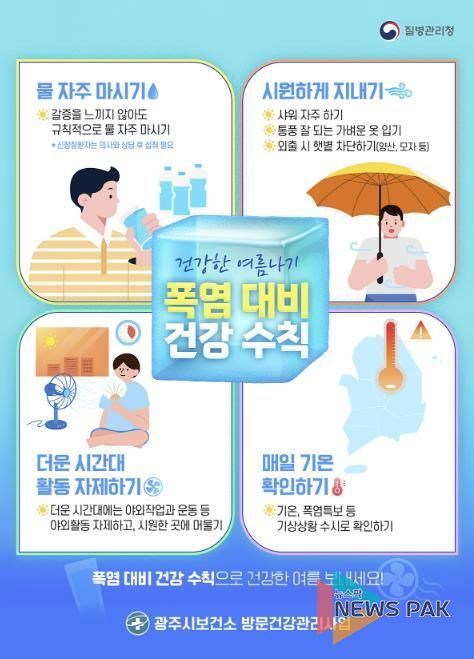 뉴스팍 이화형 기자 | 광주시는 여름철 폭염으로 인한 건강 피해를 예방하기 위해 오는 9월까지를 폭염 대응 중점 관리기간으로 지정하고 건강 취약계층에 대한 방문 건강관리 서비스를 강화한다고 12일 밝혔다.