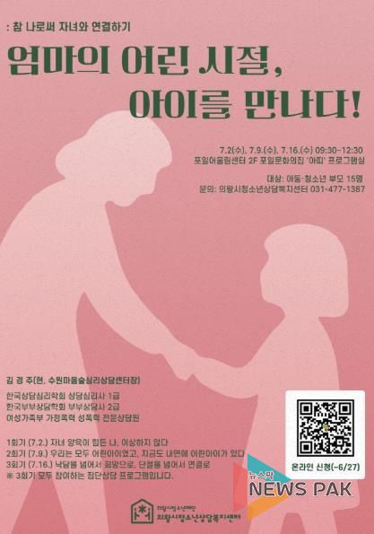 뉴스팍 류은정 기자 | 의왕시청소년재단 산하 의왕시청소년상담복지센터는 오는 7월 2일부터 16일까지 매주 수요일, 부모 대상 집단상담 프로그램 ‘엄마의 어린 시절, 아이를 만나다’를 운영한다. 이번 교육은 부모의 자기이해와 자기돌봄을 통해 자녀와의 안정적 관계 형성을 돕기 위한 심층 부모 교육이다.