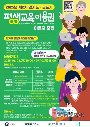 뉴스팍 배상미 기자 | 군포시는 지난 4월 1차 모집을 통해 저소득층과 장애인 266명을 선정하여 지원에 이어 6월 26일부터 7월 10일까지 2025년 제2차 평생교육이용권 신청을 받는다고 밝혔다.