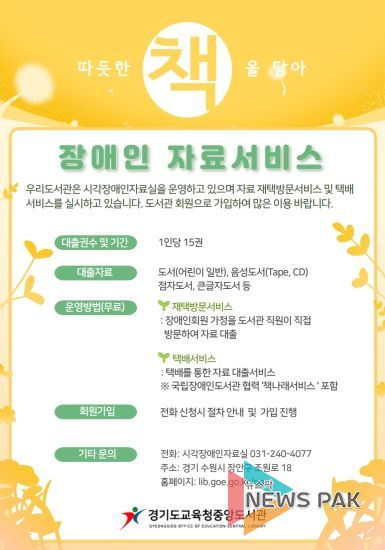 뉴스팍 배상미 기자 | 경기도교육청중앙도서관이 모두가 책을 읽는 즐거움을 누릴 수 있도록 ‘장애인 자료서비스’를 운영한다.