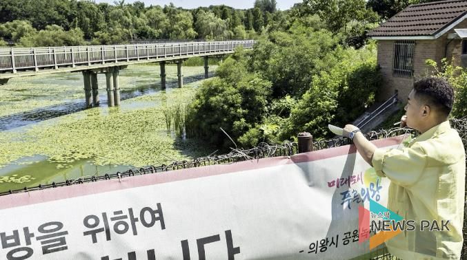 뉴스팍 류은정 기자 | 의왕시의회 한채훈 의원은 7월 11일 오전 의왕시 왕송호수 녹조 발생 현장을 직접 찾아 물빛이 짙은 녹색으로 변하고 악취가 퍼진 호수 일대를 살피며, “이 상황은 주민들이 이미 예견한 것”이라고 지적했다.