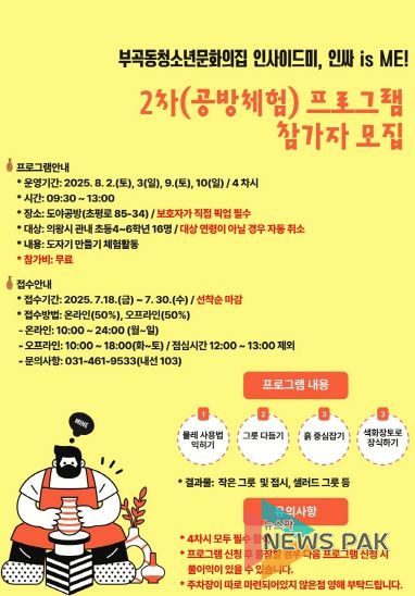 뉴스팍 류은정 기자 | (재)의왕시청소년재단(이사장 김성제) 산하 부곡동청소년문화의집이 2025년 지역 연계 위탁 프로그램(군포의왕교육청 협력사업 일환)‘인사이드미, 인싸 is ME!’의 2차(공방체험) 프로그램에 참여할 청소년을 모집한다고 밝혔다.