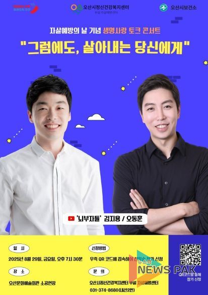뉴스팍 이소율 기자 | 오산시정신건강복지센터 부설 자살예방센터는 오는 8월 29일 오후 7시 30분, 오산문화예술회관 소공연장에서 ‘세계 자살예방의 날’을 기념해 생명존중 문화를 확산하고 자살 예방의 중요성을 알리기 위한 ‘생명사랑 토크 콘서트’를 개최한다고 밝혔다.