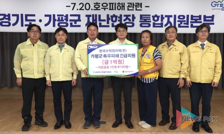 뉴스팍 배상미 기자 | 가평군은 한국수력원자력㈜ 한강수력본부가 최근 집중호우로 큰 피해를 입은 지역의 복구를 지원하기 위해 1억 원의 긴급지원금과 생필품을 전달했다고 23일 밝혔다.