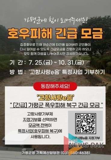 뉴스팍 배상미 기자 | 가평군이 최근 집중호우로 큰 피해를 입은 지역의 복구를 위해 ‘고향사랑기부제’의 특정사업 기부 방식을 활용한 긴급 재원 마련에 나섰다. 특정사업 기부를 통한 호우피해 긴급 모금 기간은 이달 25일부터 10월 31일까지다.