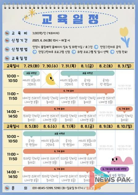 뉴스팍 배상미 기자 | 안양시가 여름방학을 맞아 ‘2050 탄소중립’ 실현을 위한 기후변화 대응 교육의 일환으로 유아 및 초등학생 대상 ‘여름방학 특별프로그램’을 7월 29일부터 10일간 운영한다고 29일 밝혔다.