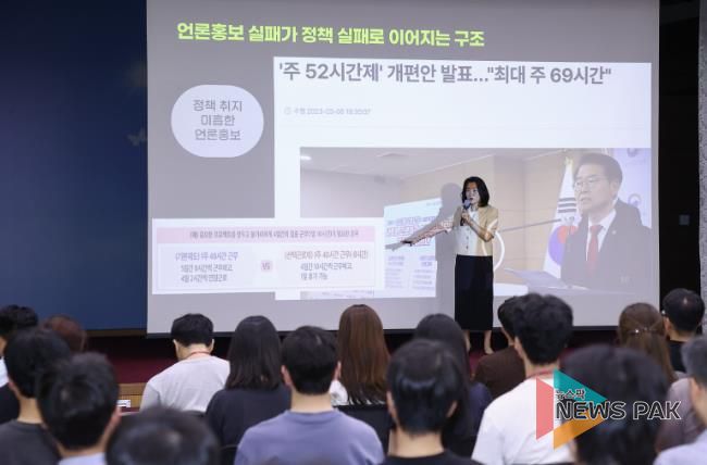 특히, 언론홍보의 핵심인 보도자료 작성법에 관한 강의에서는 ▲기사 구성 방식 ▲문장 표현 요령 ▲제목 작성 전략 ▲사진 선정 등 홍보 효과를 높이는 실무 노하우가 구체적인 예시와 함께 제시되면서 공직자들이 홍보 업무에 바로 활용할 수 있는 실질적인 도움을 제공했다.