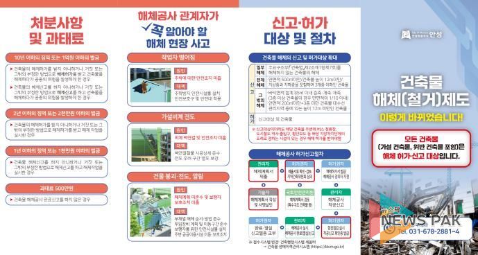 뉴스팍 이소율 기자 | 안성시는 지난 2020년 5월 1일 제정·시행된 건축물관리법이 2022년 8월 4일부로 일부 개정되면서 처벌 기준이 강화됨에 따라 무단 해체를 최소화하기 위한 건축물 해체 관련 리플렛을 제작하여 각 읍·면·동에 배부했다.