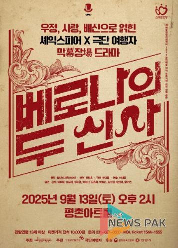 뉴스팍 배상미 기자 | 안양문화예술재단은 2025년 공연예술 지역 유통지원 사업 선정작인 연극 '베로나의 두 신사'를 오는 9월 13일 오후 2시 평촌아트홀에서 선보인다고 1일 밝혔다. 이번 공연은 지역 사회에 수준 높은 공연예술 향유 기회를 제공하고, 관객과의 소통을 확대하기 위해 마련됐다.