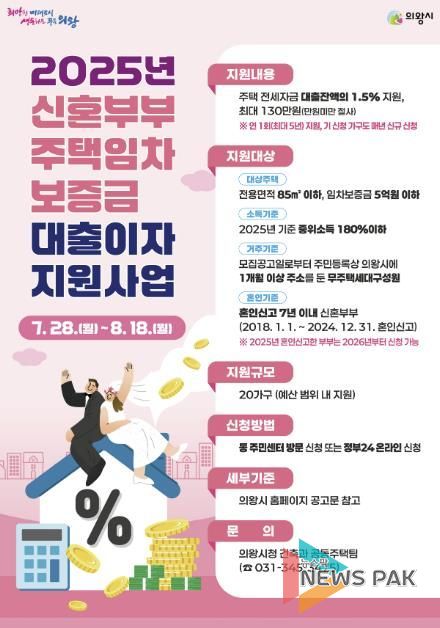 뉴스팍 류은정 기자 | 의왕시는 무주택 신혼부부의 자립 기반 마련을 위한'2025년 신혼부부 주택임차보증금 대출이자 지원사업'의 신청자를 이달 18일까지 모집한다고 밝혔다.