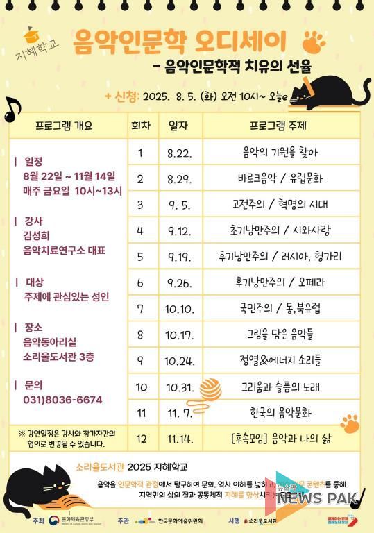 뉴스팍 이소율 기자 | 오산시는 오는 8월 22일부터 11월 14일까지, 소리울도서관에서 시민 대상 인문학 강좌 ‘2025 지혜학교 – 음악인문학 오디세이’ 프로그램을 운영한다고 밝혔다.