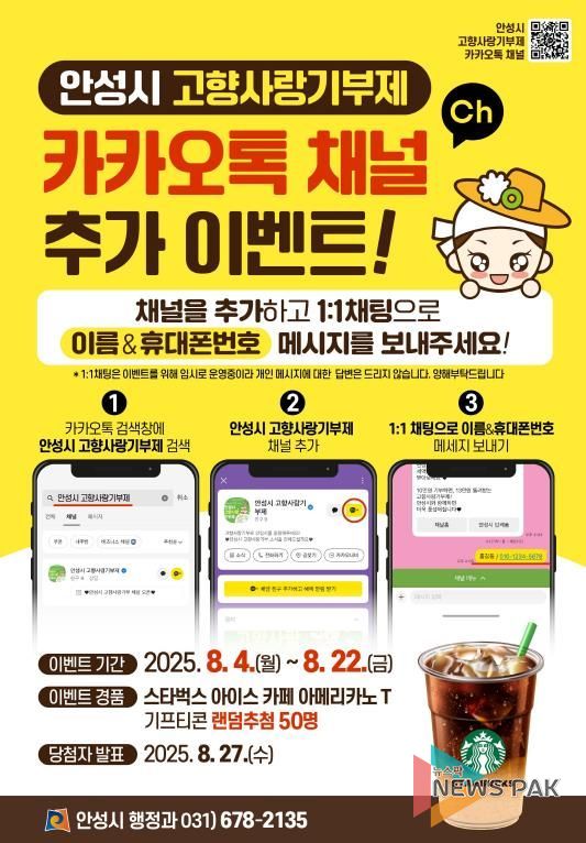 뉴스팍 이소율 기자 | 안성시가 오는 22일까지 ‘안성시 고향사랑기부제 카카오톡 채널’ 개설 기념 채널 친구 추가 이벤트를 진행한다.