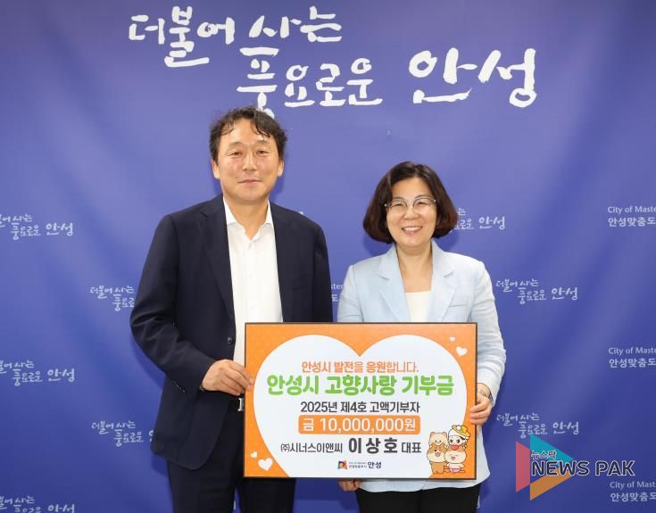 뉴스팍 이소율 기자 | 안성시는 ㈜시너스이앤씨 이상호 대표가 안성시에 고향사랑기부금 1,000만 원을 기탁하며 2025년 제4호 고액기부자로 이름을 올렸다고 밝혔다.
