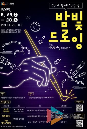 뉴스팍 이소율 기자 | 안성시가 야간 공공문화 프로그램 ‘안성 밤마실’의 일환으로 감각적인 예술 체험 행사 ‘밤빛드로잉: 우리가 함께 그리는 밤’을 선보인다. 이번 프로그램은 8월 29일부터 30일까지 양일간, 시옷갤러리(공도 중앙어린이 공원)에서 오후 7시부터 9시까지 운영된다.