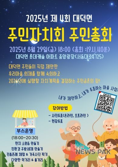 뉴스팍 이소율 기자 | 대덕면 주민자치회는 오는 8월 29일 오후 6시, 롯데캐슬아파트 중앙광장에서 개최되는 ‘2025년 제4회 대덕면 주민자치회 주민총회’를 앞두고, 주민 누구나 쉽게 제안 사업 투표에 참여할 수 있도록 사전투표를 활발히 진행 중이다.