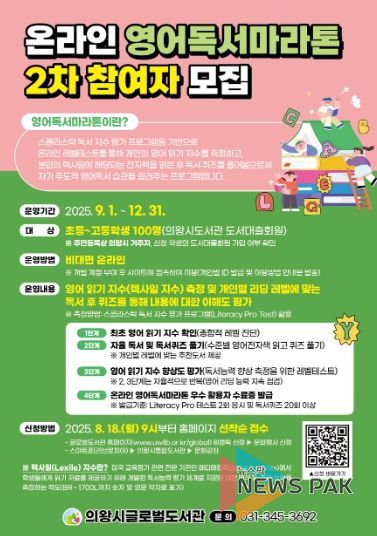 뉴스팍 류은정 기자 | 의왕시 글로벌도서관은 '온라인 영어독서마라톤'의 2차 참여자를 모집한다고 밝혔다.
