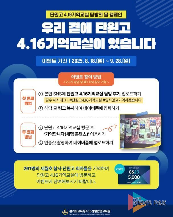 뉴스팍 배상미 기자 | 경기도교육청4.16생명안전교육원이 ‘단원고 4.16기억교실 탐방의 달’캠페인 이벤트를 진행한다.