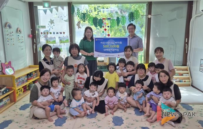 이번 성금은 SK베베어린이집이 7월 24일 원아, 학부모 및 교직원이 함께 관내 어려운 이웃을 돕기 위해 추진한 아나바다 바자회 행사 수익금으로 마련됐다.