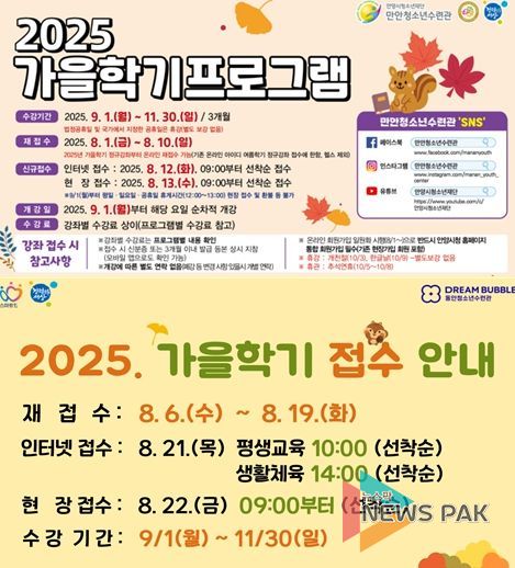 뉴스팍 배상미 기자 | 안양시청소년재단 산하 만안청소년수련관과 동안청소년수련관이 2025년 가을학기 강좌 수강생을 모집한다.