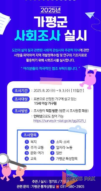 뉴스팍 배상미 기자 | 가평군은 군민들의 삶의 질을 높이기 위해 실시하는 ‘2025 가평군 사회조사’에 군민들의 적극적인 협조와 참여를 당부했다. 군은 8월 20일부터 9월 3일까지 경기도와 공동으로 2025년 사회조사를 실시한다.
