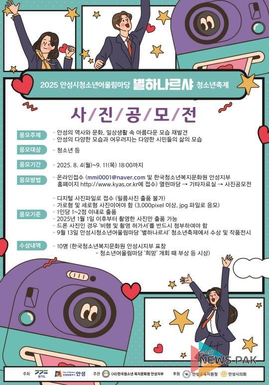 뉴스팍 이소율 기자 | 한국청소년복지문화원 안성지부는 청소년의 시선으로 바라본 안성의 정겨움과 아름다움을 담는 사진 공모전을 개최한다. 이번 공모전은 ‘2025 안성시 청소년어울림마당-별하나르샤 청소년축제’와 연계해 진행된다.