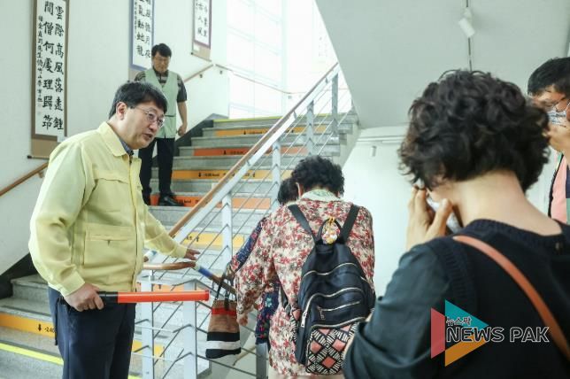 시는 재난취약계층이 밀집된 다중이용시설 중 한 곳인 의왕시아름채노인복지관을 시범 훈련장소로 선정, 공습경보 발령에 따라 직원 및 건물 내 이용 시민들이 계단을 통해 지하 1층 대피소로 신속히 대피하는 훈련을 실시했다.