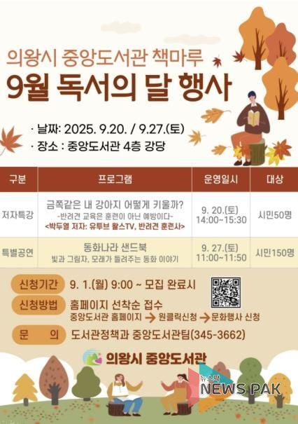 뉴스팍 류은정 기자 | 의왕시 중앙도서관은 9월 독서의 달을 맞아 시민들이 책 속 이야기를 더욱 생생하게 경험할 수 있도록 저자 초청 강연과 샌드아트 공연을 운영한다.