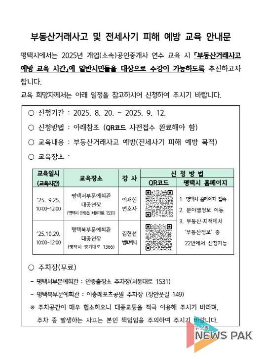 뉴스팍 이소율 기자 | 평택시는 개업(소속)공인중개사 및 중개인 700명과 교육 참여를 희망하는 시민들을 대상으로 ‘2025년 공인중개사 연수교육’을 실시한다.