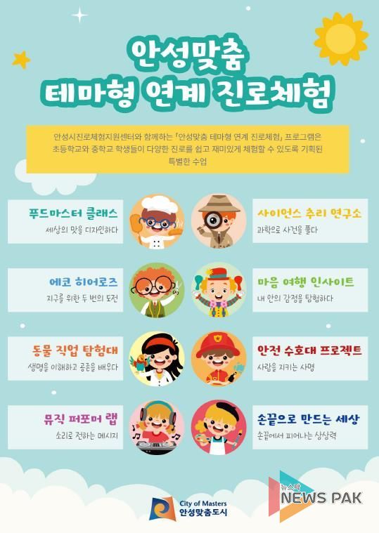 뉴스팍 이소율 기자 | 안성시는 학생의 적성과 흥미를 반영한 체험 중심 진로교육을 통해 성장 잠재력 개발과 진로 역량 강화를 도모하고자 2025년 9월부터 12월까지 관내 초·중학생을 대상으로 ‘안성맞춤 테마형 연계 진로체험 프로그램’을 운영한다고 밝혔다.