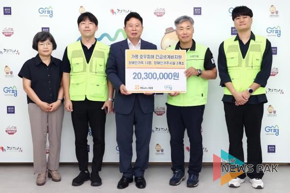 뉴스팍 배상미 기자 | (사)희망을주는사람들이 21일 가평군청을 찾아 집중호우로 피해를 입은 장애인가족과 장애인거주시설을 지원하기 위해 성금 2,030만원을 기탁했다.