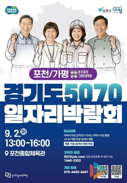 뉴스팍 배상미 기자 | 경기도와 경기도일자리재단, 가평군, 포천시는 오는 9월 2일 포천종합체육관에서 50~70대 중장년층의 재취업을 지원하는 ‘2025 경기도 5070 일자리박람회 in(인) 포천+가평’을 연다.