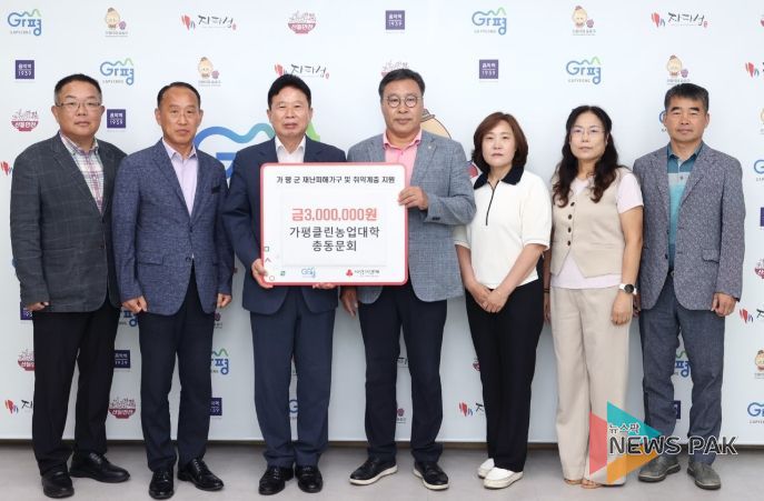 뉴스팍 배상미 기자 | 가평클린농업대학 총동문회가 최근 집중호우로 큰 피해를 입은 가평군에 성금 300만원을 전달했다. 이번 성금은 총동문회원들이 200만원, 임원진이 100만원을 모아 마련한 것이다.