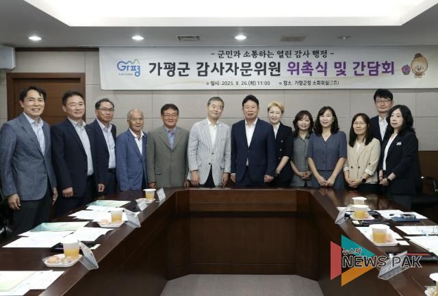 뉴스팍 배상미 기자 | 가평군이 감사 역량 강화를 위해 ‘감사자문위원회’를 공식 출범시켰다. 군은 26일 위촉식을 열고 법률, 행정, 세무, 회계 등 각 분야 전문가 12명을 감사자문위원으로 위촉했다.